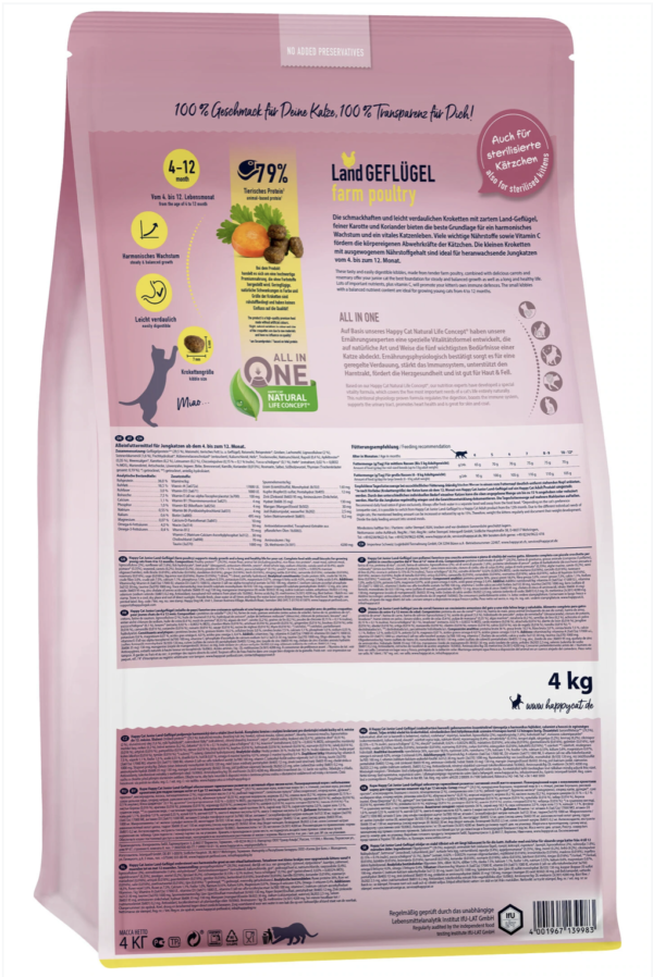 The tasty, easily digestible kibbles with tender farm-poultry and delicious carrot and coriander offer the best basis for harmonious growth and a healthy, active life. The many important nutrients and vitamin C help to support the kitten’s own defence systems.