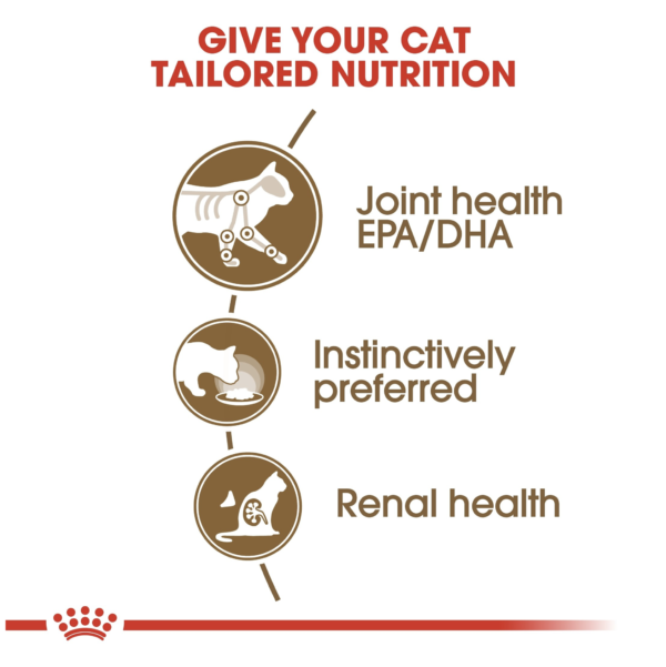 To ensure that your senior cat (aged 12 or over) receives the specific nutrition it needs to help maintain optimal health, you will need to feed it a diet that it will prefer naturally and instinctively. That’s why ROYAL CANIN® Ageing 12+ in Gravy is formulated to match the optimal Macro Nutritional Profile that is instinctively preferred by ageing cats like yours. Senior cats will often need higher levels of nutritional support for the overall maintenance of good joint health. This is why ROYAL CANIN® Ageing 12+ in Gravy is specially formulated to help maintain healthy joints through a high level of Omega-3 fatty acids – specifically EPA and DHA. To help support healthy kidney function and overall renal health, ROYAL CANIN® Ageing 12+ in Gravy also contains an adapted phosphorus content. To cater to each cat’s individual preferences, ROYAL CANIN® Ageing 12+ is also available in a succulent jelly, or as dry food with tasty and crunchy kibble. If you’re considering mixed feeding, simply follow our feeding guidelines to ensure your cat gets an accurate amount of both wet and dry food for optimal benefit.