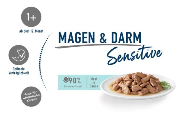 Happy Cat Meat in Sauce Stomach & Intestine Diet, easily digestible and very tasty, has been developed especially for cats with a sensitive digestion.