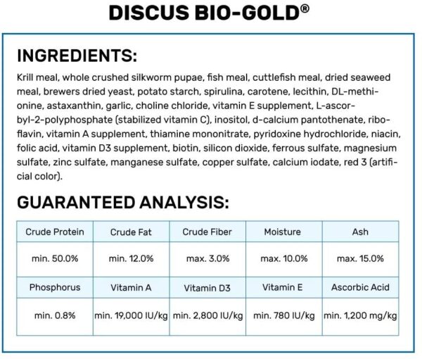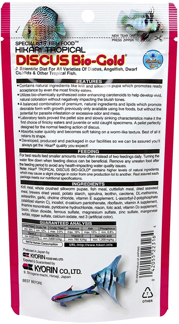 Laboratory tests proved the pellet size and slowly sinking characteristics make it the first choice of finicky eaters and juvenile or wild caught specimens. A pellet perfectly designed for the normal feeding action of discus.